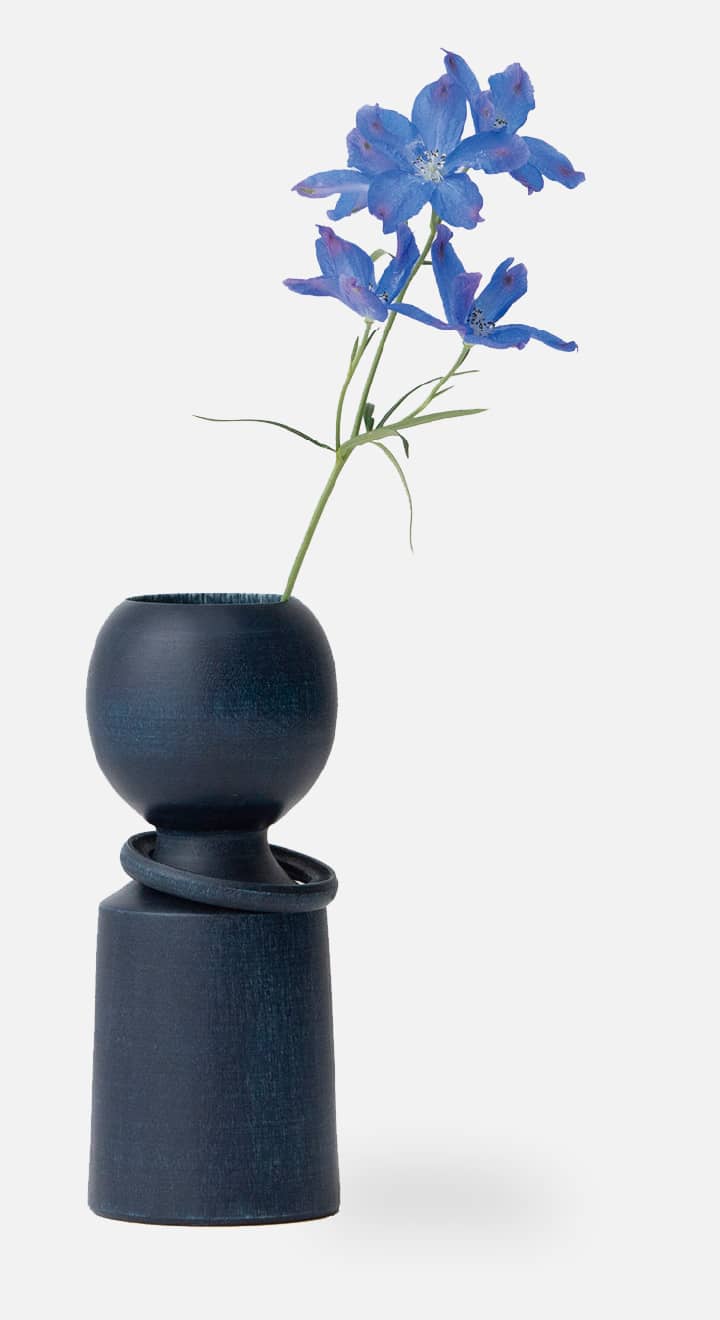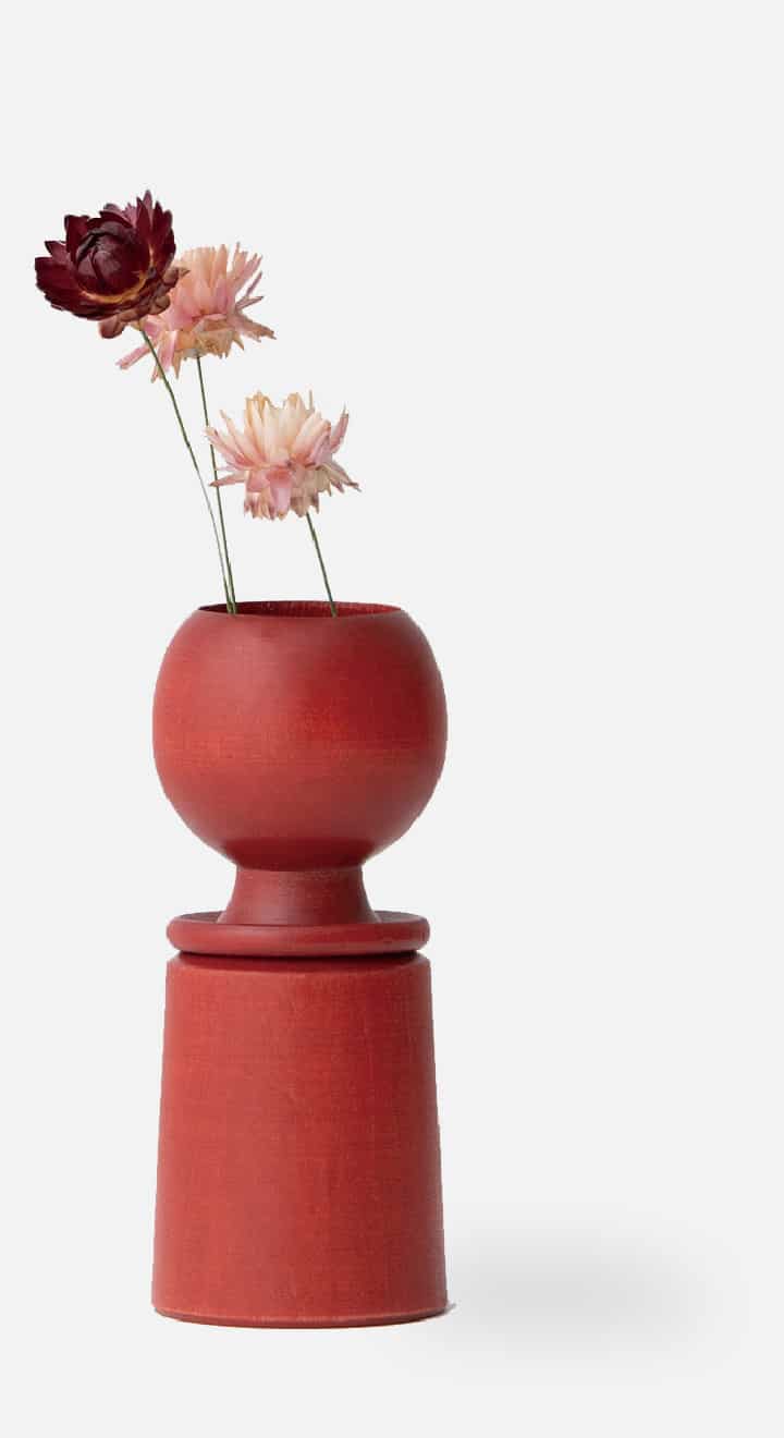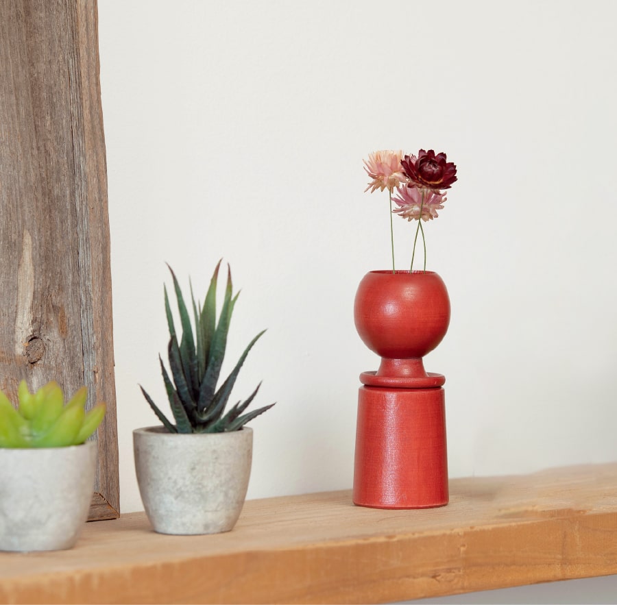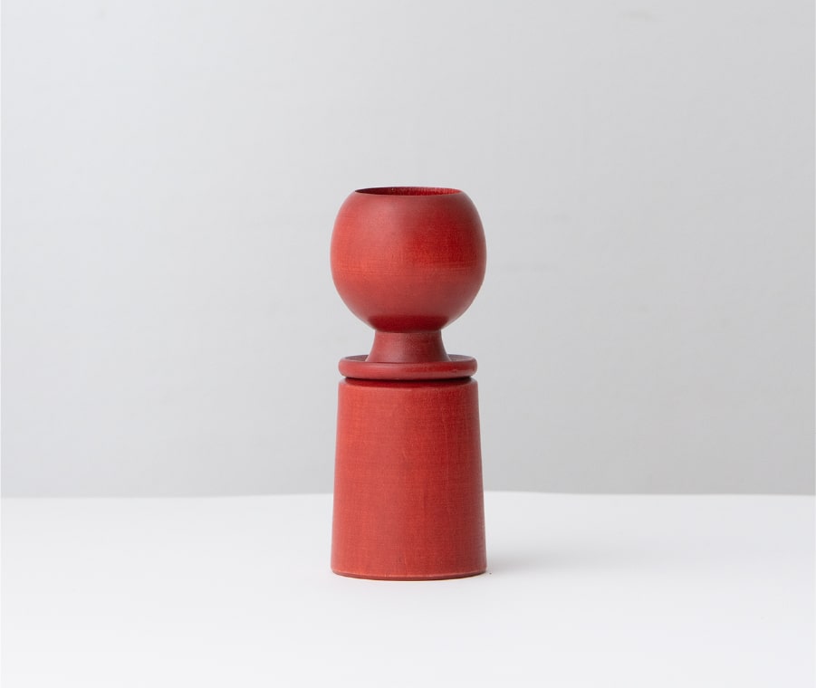 夕焼けのような濃い茜(あかね)に染め上げられた 「緋色(あけいろ)」のこけしです。首元のハピネスリングがポイントとなるちょっと背の高いサイズの一輪挿しとなっています。玄関やテーブルなどのインテリアアクセントとしてお使いいただけます。