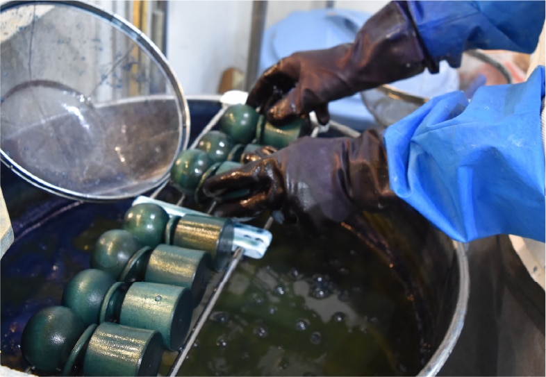 東京染めこけしの色合いは全て「草木染め」で染色したものです。通常衣類などに多く用いられる草木染めを木に施し、一切塗料を使うことなく、やさしく自然な風合いを出しています。