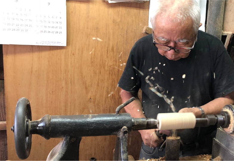 こけしには色々な木材が使われる場合がありますが、東京染めこけしは、その中でも最も白いといわれるミズキを使用しています。そんなこけしを手がけるのは、八王子でこけしを作り続けて40年余りの熟練の職人。一つひとつ丁寧な仕事でこけしを削りだしていきます。